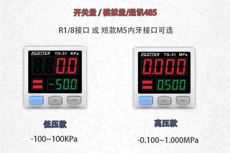 ECOTTER數(shù)顯壓力表有高壓款-0.1~1mpa 和 低壓款 -100~100kpa兩種量程不同的規(guī)格,低壓款常用于負壓檢測。這個系列產(chǎn)品有開關(guān)量、模擬量及通訊485款可選。