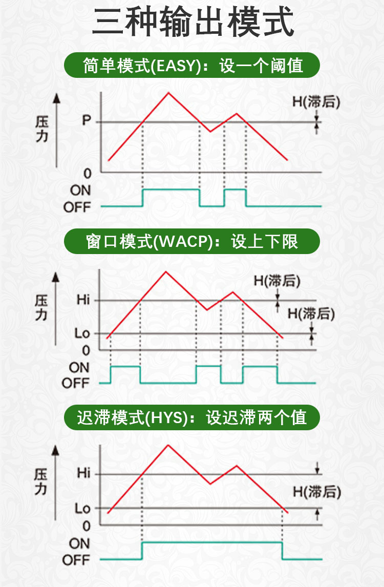 ECOTTER數(shù)顯壓力表可實現(xiàn)智能檢測,多種輸出模式,簡單模式可設(shè)置一個閥值,窗口比較模式能設(shè)上限和下限兩個閥值,進行區(qū)間輸出。還有應(yīng)差模式,設(shè)置兩個閥值,起到遲滯的效果。