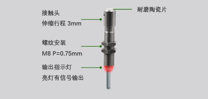 ECOTTER自主研發(fā)了接觸式傳感器S2-CS078和探桿式S2-CS089系列,常用于接觸檢測(cè)、原點(diǎn)定位等工業(yè)自動(dòng)化場(chǎng)景,S2-CS078接觸面帶耐磨陶瓷片,產(chǎn)品使用更長(zhǎng)久。