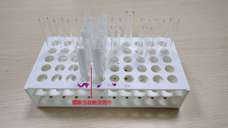 技術分析知道,是環(huán)境光產(chǎn)生了變化,造成的影響。滿排的試管和零星不滿排的試管分布排的環(huán)境光的比較大的差別,影響光電開關的正常檢測。知道了原因之后,ECOTTER技術人員給出了兩種解決方案,第一種是在沒有背景的檢測環(huán)境增加檢測背景,比如在傳感器到被檢測物試管后面加一塊擋板,平衡環(huán)境光。