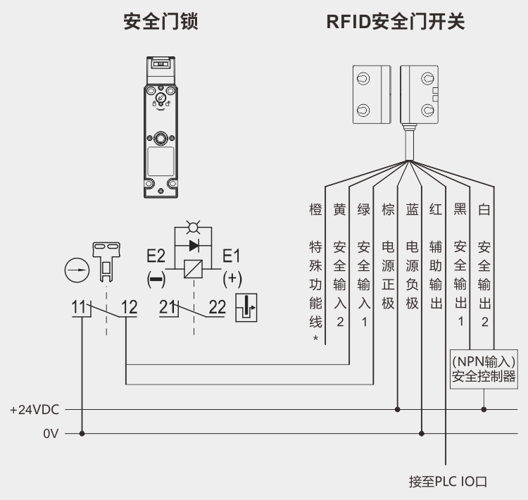 選型時(shí),我們需要關(guān)注鑰匙控制這一項(xiàng),選擇插鑰匙觸點(diǎn)導(dǎo)通的安全門鎖。然后進(jìn)行接線,接線時(shí)根據(jù)非接觸安全門開關(guān)的類型,比如NPN型的,我們?cè)诎踩T鎖的觸點(diǎn)接一邊負(fù)極,一邊接非接觸安全門開關(guān)的信號(hào)輸入線,讓鑰匙插入時(shí)觸點(diǎn)導(dǎo)通,相當(dāng)于導(dǎo)通負(fù)極和開關(guān)的信號(hào)輸入線。下面我們通過圖來(lái)了解接線。