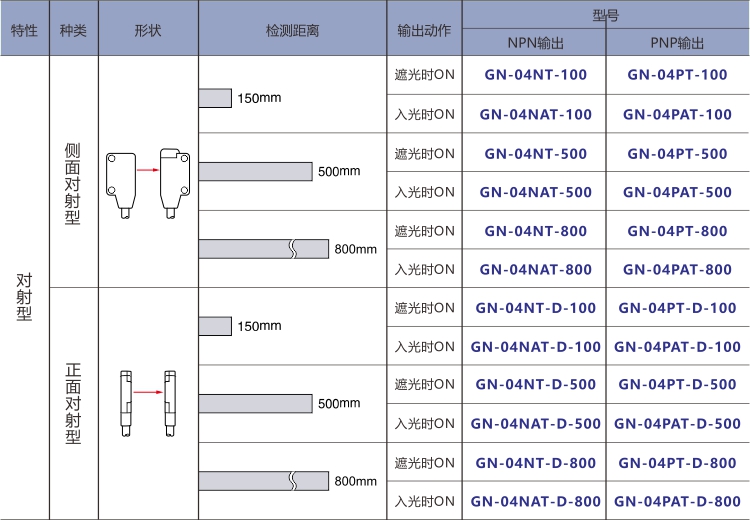 ECOTTER 超薄對射光電開關 GN-04T系列 有正面對射和側面對射款,安裝距離(檢測距離)可選100mm\500mm\800mm,可根據(jù)應用情況選擇。