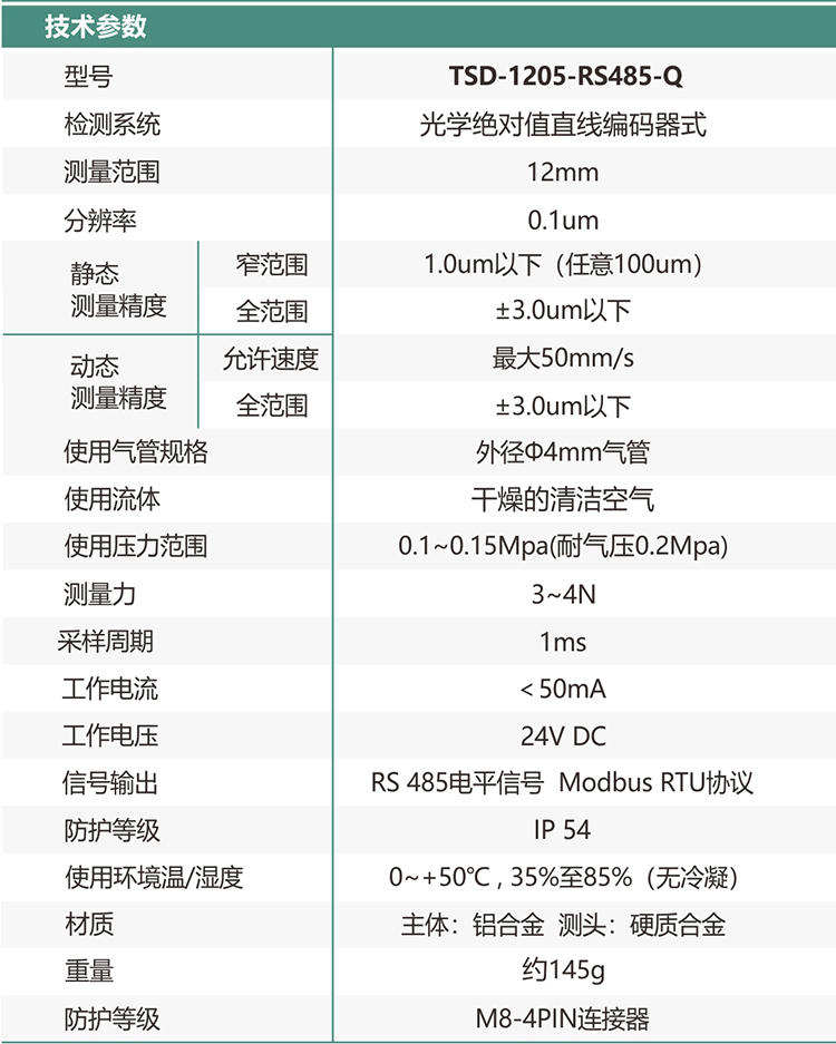 TSD-1205-RS485-Q 氣動款,連接直徑4毫米氣管,使用氣壓范圍1~1.5mpa,通氣時探桿將被推出,伸出進行測量,這款接觸位移傳感器量程12.5mm,重復精度0.5um,測量精度可達3um,滿足工業(yè)大部分測量需求。