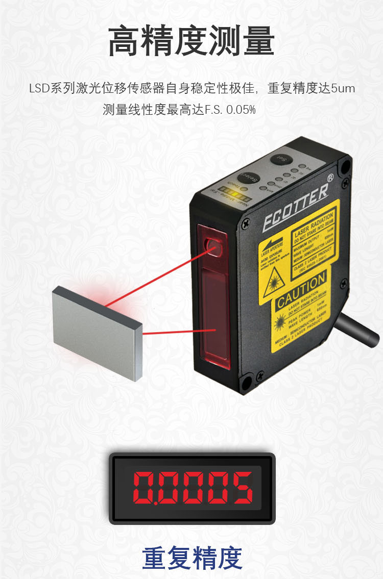 ECOTTER 激光位移傳感器有LSD-30系列量程25~35mm款,重復精度0.5um,測量精度5um;LSD-50系列量程40~60mm款,重復精度3um,測量精度20um;LSD-85系列量程65~105mm款,重復精度5um,測量精度50um;LSD-250系列量程100~400mm款,重復精度20um,測量精度500um。