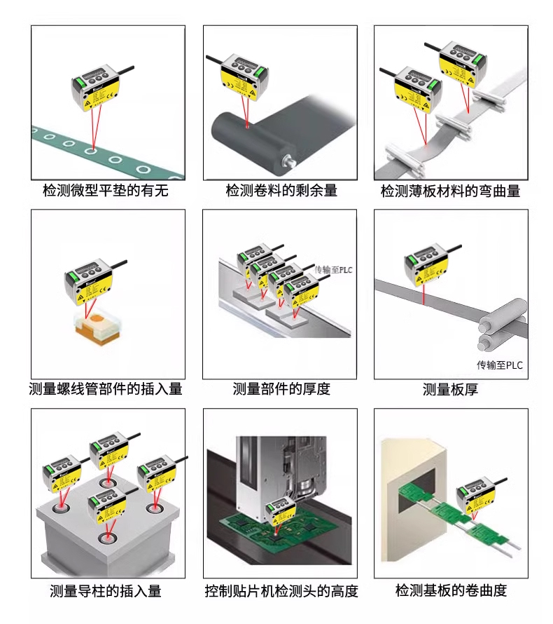 激光位移傳感器是新型測量儀表,能夠精確非接觸測量物體的位置、位移等變化,可以測量厚度、振動、距離、直徑、偏移度、平面落差等,應(yīng)對大部份工業(yè)自動化的探測需求。