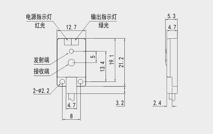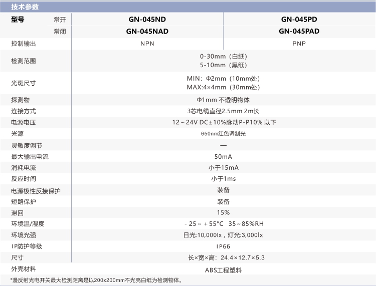 超薄型光電開關(guān)GN-045D系列采用小光斑尺寸設(shè)計(jì),檢測距離達(dá)到30mm,30mm處光斑僅為3*3mm; 配備方便觀察的雙色指示燈一一紅色電源指示燈與綠色輸出指示燈。