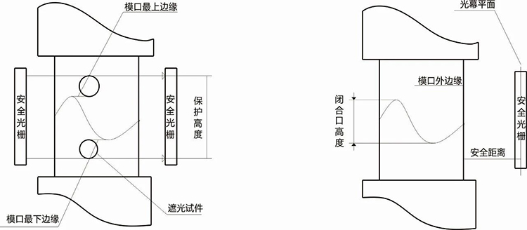安全光幕高度位置是指安全光柵的光幕相對于機(jī)床上下??诘奈恢谩T诒WC安全間隔的條件下,安全光柵的最下一束光不得高于模口下邊沿,最上一束光不得低于??谏线呇?。