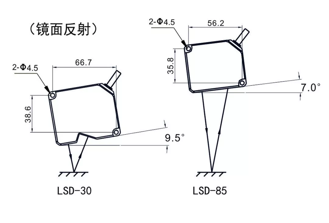 對(duì)鏡面反射表面的檢測(cè),請(qǐng)保證投光部的面與測(cè)定對(duì)象物成一定夾角,使發(fā)射的激光經(jīng)測(cè)定物反射后進(jìn)入受光部。