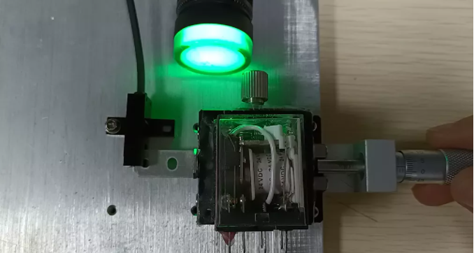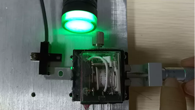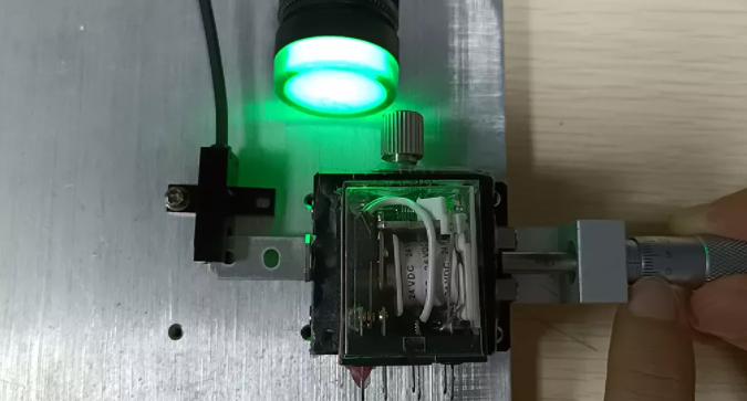 這里有一個重復精度測試儀器,我們可以通過旋動標尺推動另一端的物塊前進,直到傳感器發(fā)出信號,此時我們記錄下這個標尺的位置。