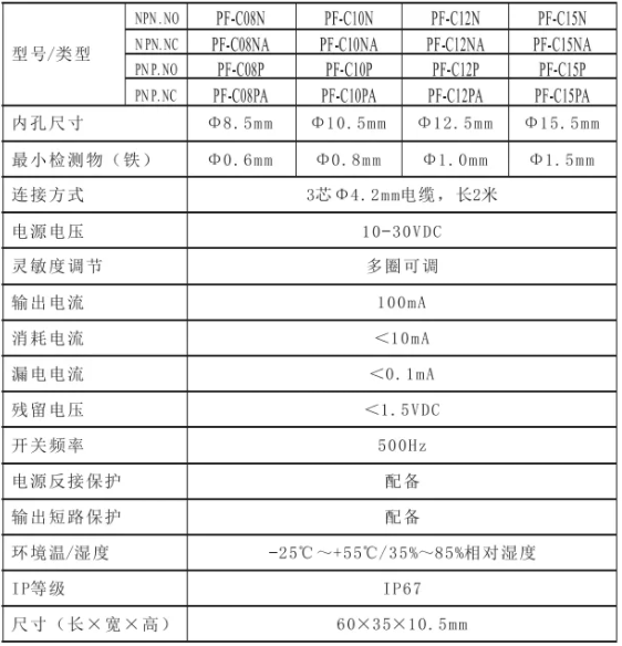 這款接近開關(guān)的整體是環(huán)形,檢測(cè)區(qū)域?yàn)閳A型,有多種尺寸可供選擇。其最小檢測(cè)物體也隨著檢測(cè)區(qū)域大小的變化而變化。最小檢測(cè)物可檢測(cè)0.6mm的磁性物體(孔徑8.5mm)